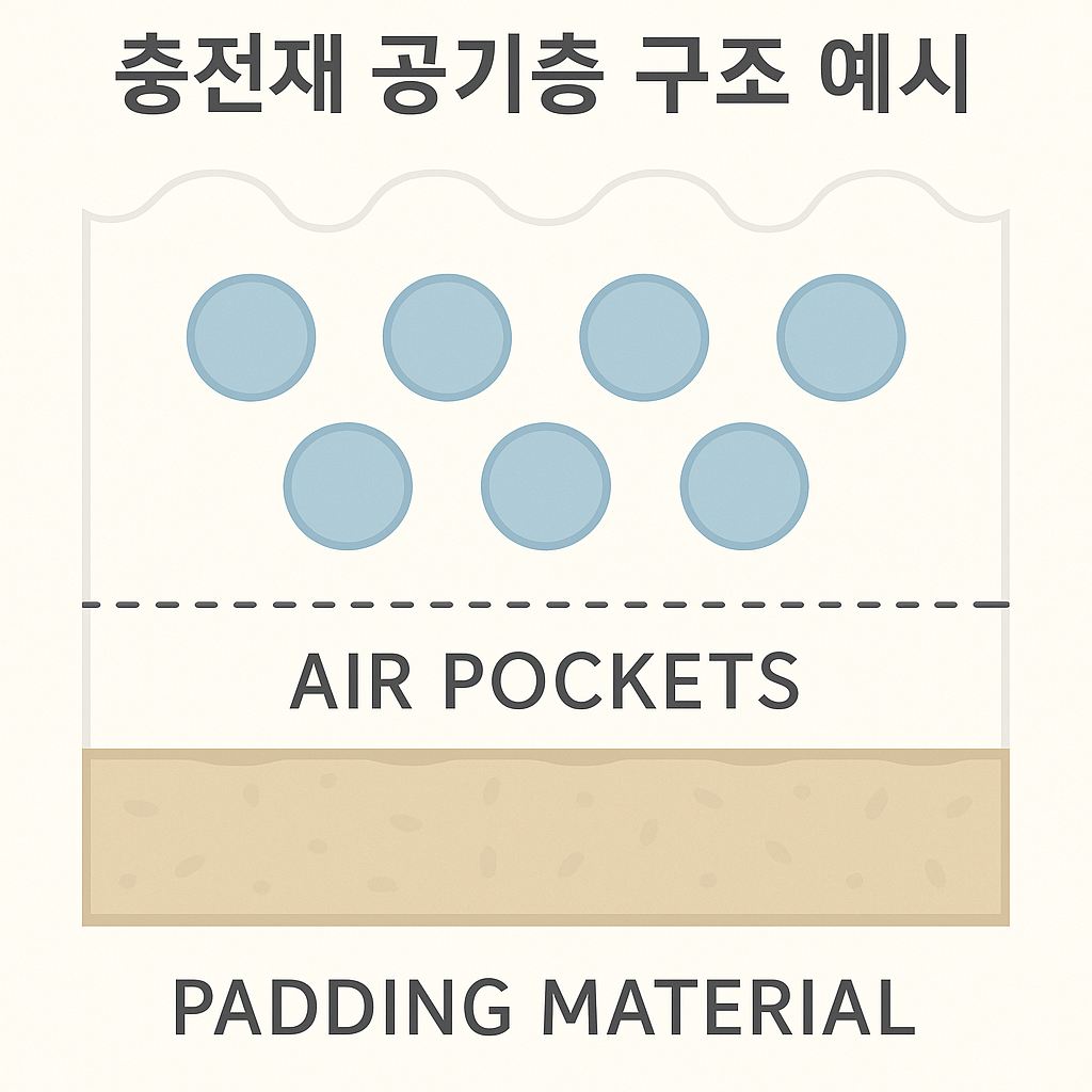 충전재(Insulation Material)는 옷 내부의 공기층을 형성하여 체온을 유지하는 핵심 구성 요소입니다.