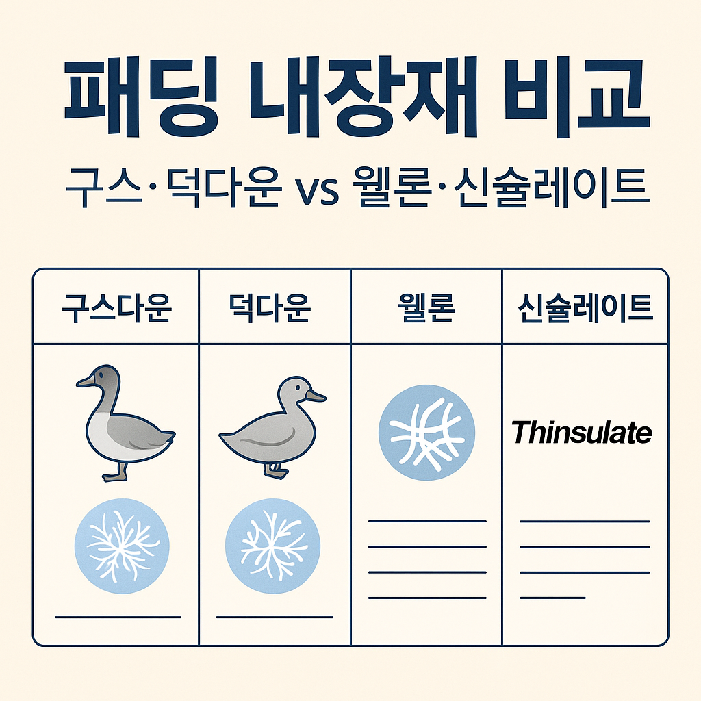 패딩 충전재 비교 가이드 — 구스·덕다운 vs 웰론·신슐레이트