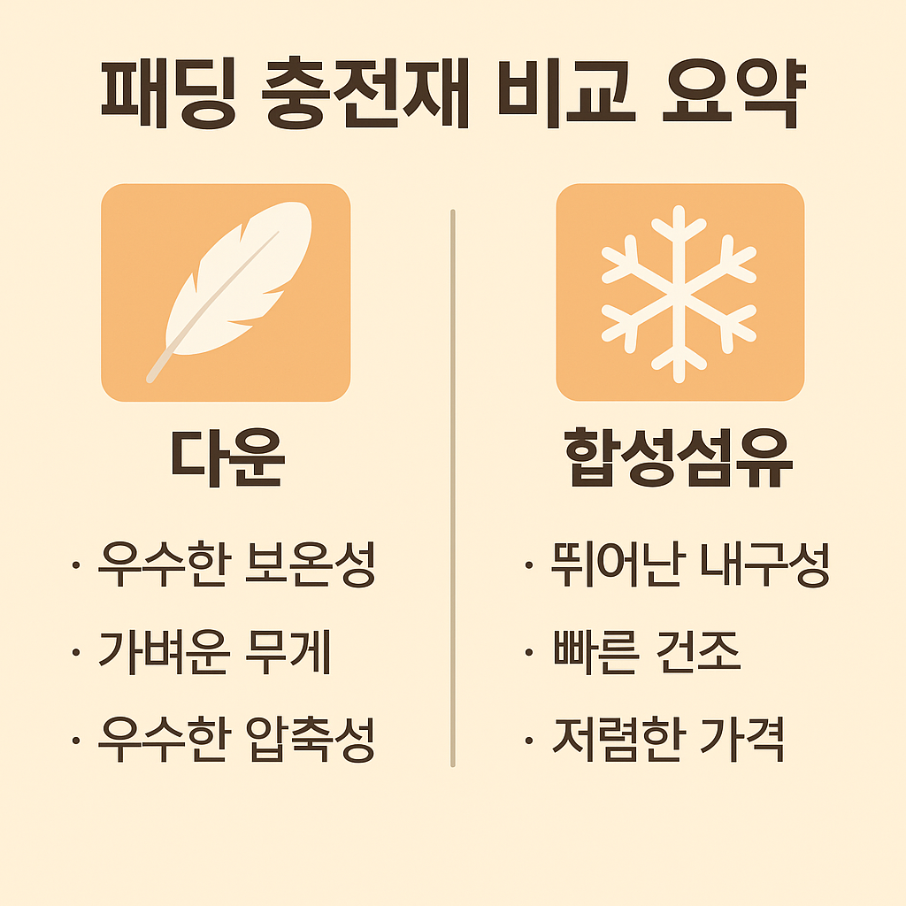 이 글에서는 대표적인 패딩 충전재 네 가지 — 구스다운, 덕다운, 웰론, 신슐레이트를 비교해 어떤 용도에 적합한지 안내합니다.