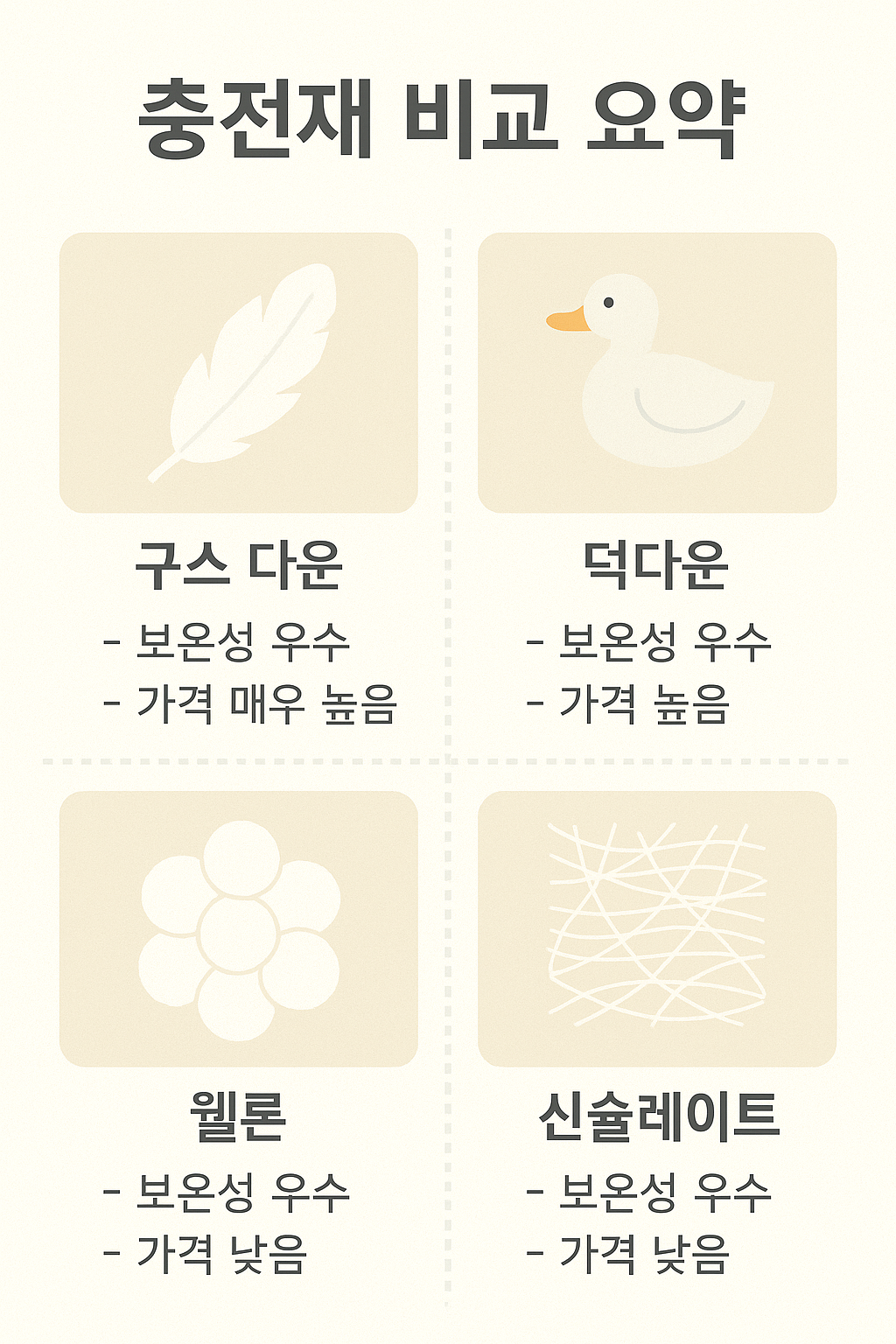 구스다운은 최고급 보온성, 덕다운은 가성비, 웰론은 관리 편의성, 신슐레이트는 실용성과 경량성이 장점입니다.