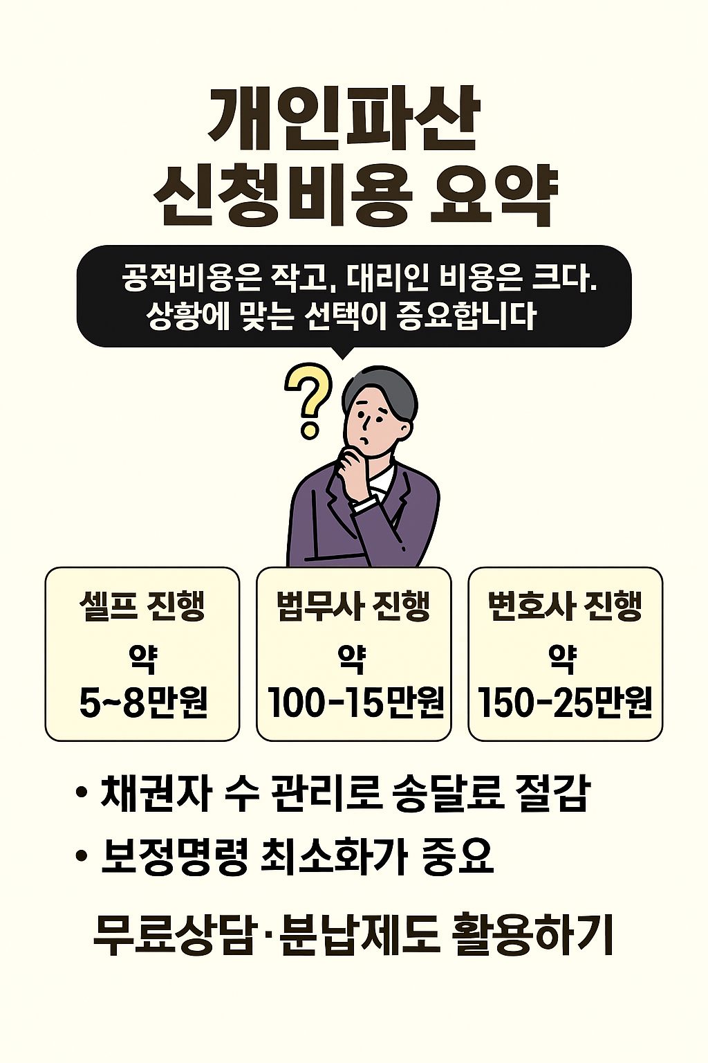 개인파산 신청비용의 핵심은 ‘공적비용은 작고, 대리인비가 크다’입니다. 따라서 상황에 맞게 선택하는 것이 가장 중요합니다.