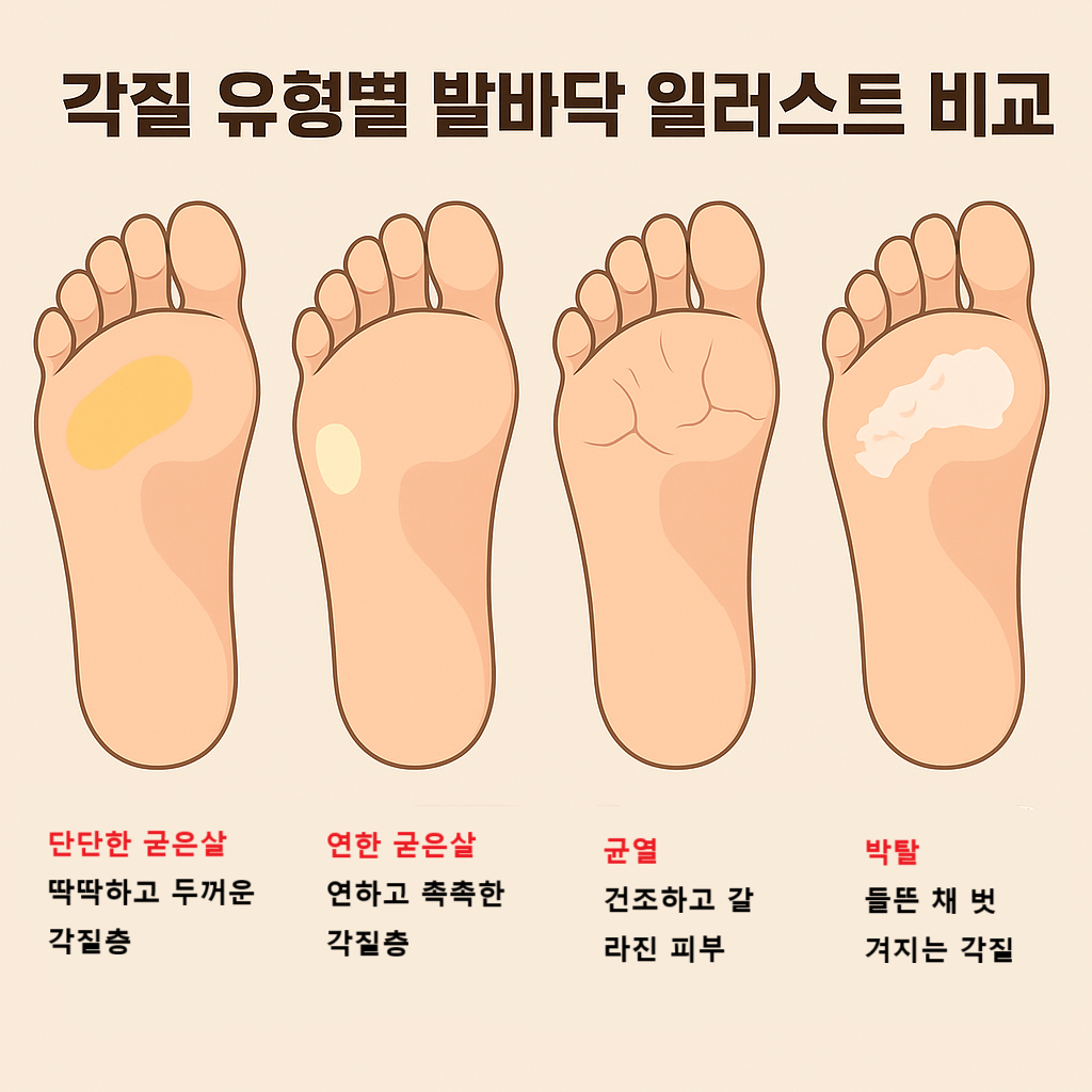 | 균열형 각질 | 뒤꿈치 갈라짐, 통증 동반 | 자극 최소화, 보호 크림 도포 |