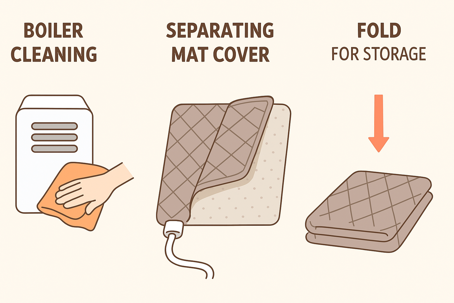 - 온수매트: 보일러·호스 내 물 청소 필요, 계절별로 배수 및 건조 관리 필수.