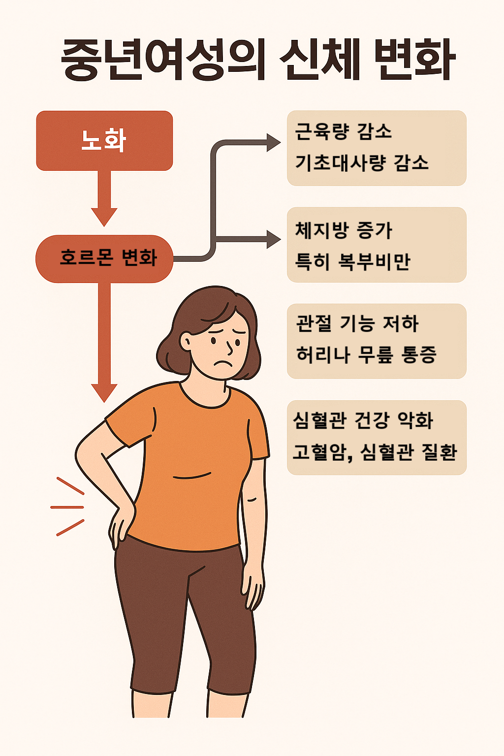 중년 여성의 신체는 근육·호르몬·신진대사 측면에서 세 가지 대표적인 변화를 겪습니다. 이 변화는 단순한 '노화'가 아니라 관리 여부에 따라 완전히 다른 삶의 질을 만들어냅니다.