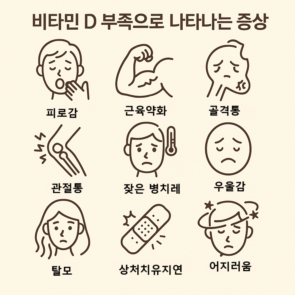 위 증상들은 하나라도 반복되면 비타민D 부족 가능성이 높으며, 여러 증상이 함께 나타날 경우 결핍 가능성이 더욱 높습니다.