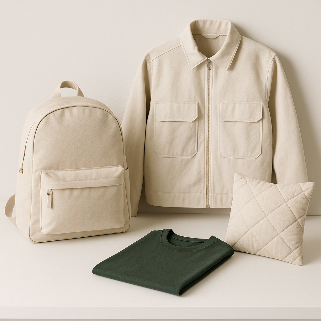 위 구성은 리사이클 패브릭이 패션뿐 아니라 일상 제품에서도 폭넓게 활용된다는 점을 보여준다.