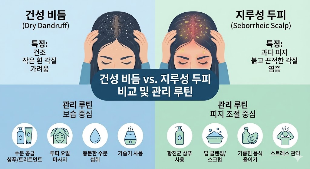 건성 비듬과 지루성 두피를 비교하고 각각의 관리 루틴을 정리한 인포그래픽.