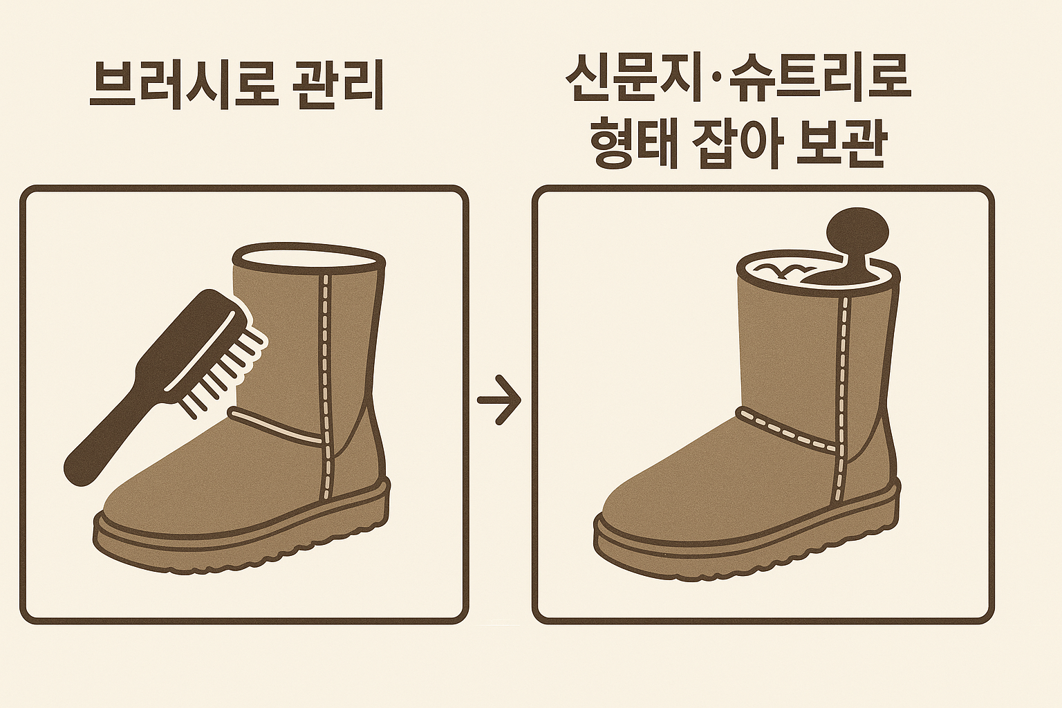 어그 부츠를 브러시로 관리하고, 신문지·슈트리로 형태를 잡아 보관하는 모습을 단계별로 보여주는 이미지