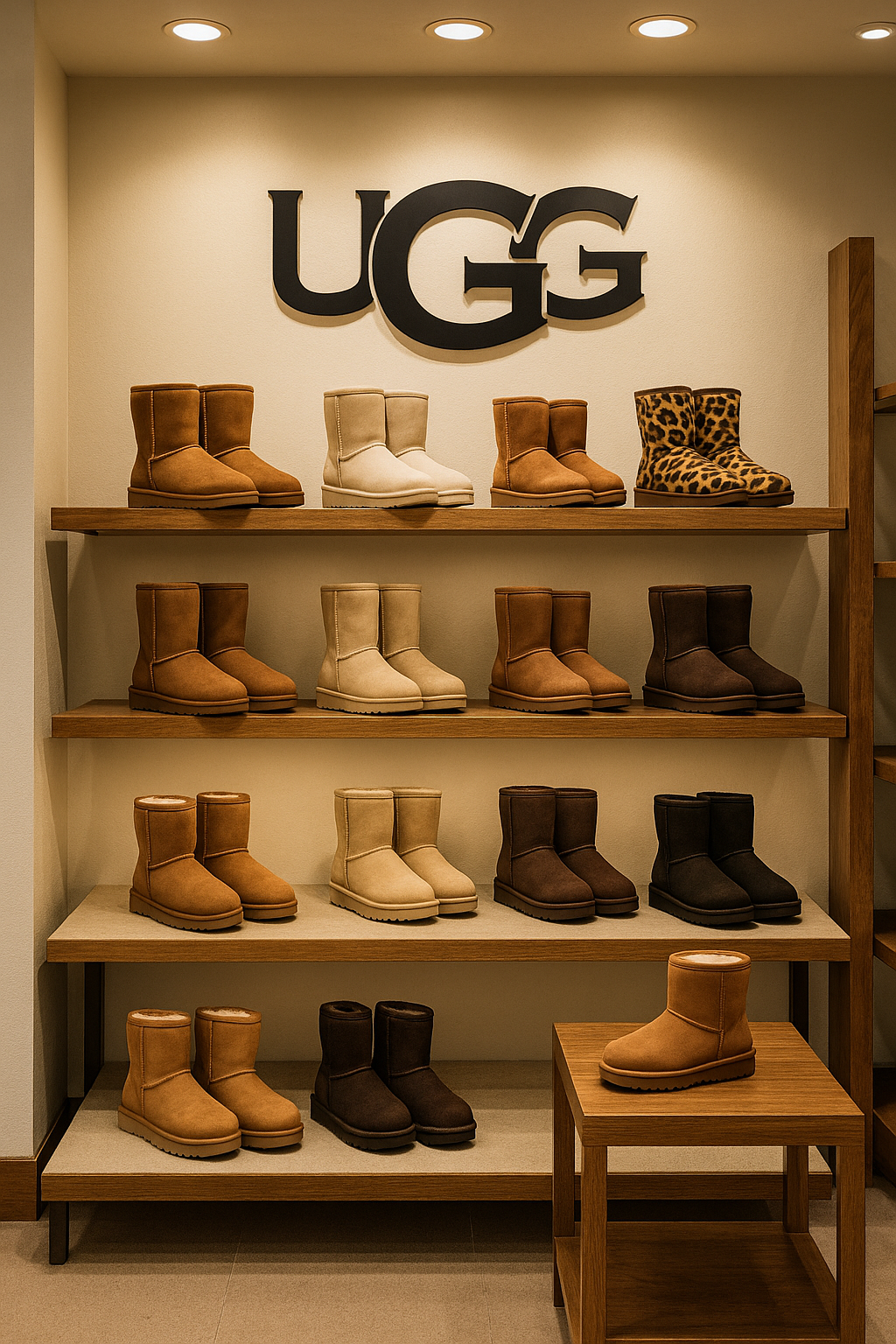 미국 브랜드 UGG 로고와 다양한 패션 스타일의 UGG 부츠가 진열된 매장
