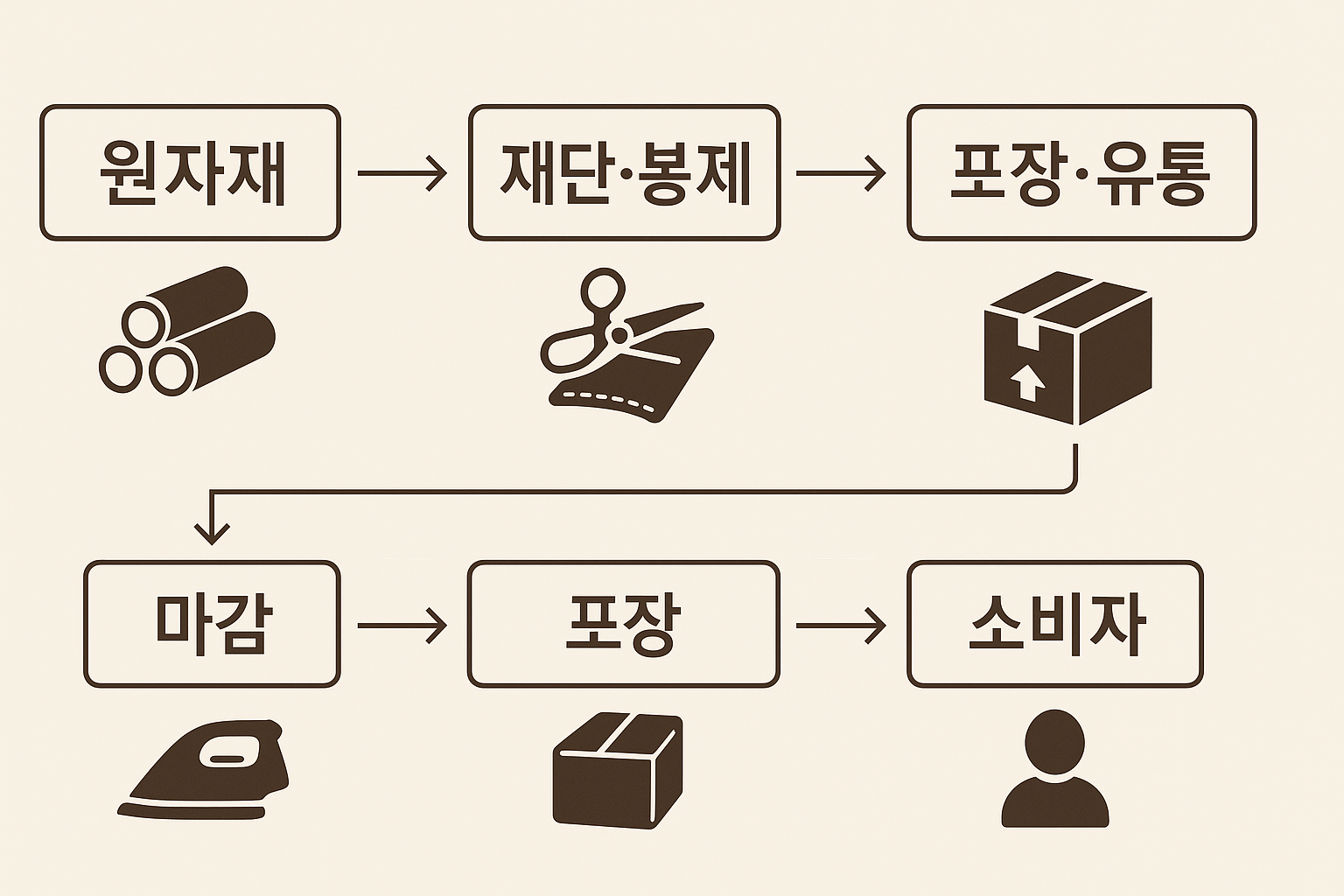 원자재 → 재단·봉제 → 마감 → 포장·유통 → 소비자’의 흐름을 단계별로 보여주는 인포그래픽