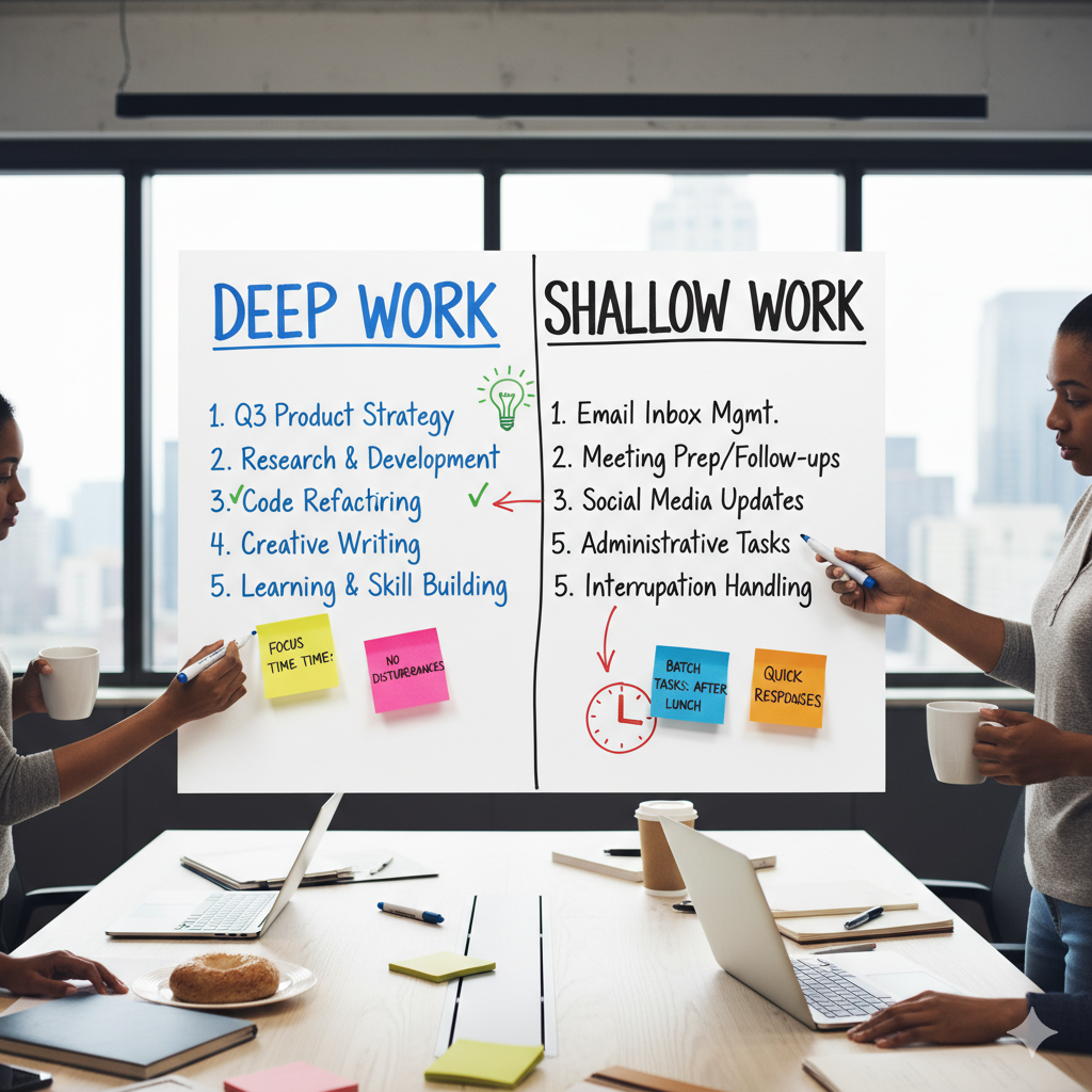 예: 메시지 확인, 상태 보고, 캘린더 정리, 간단한 포맷 편집. 얕은 일은 필요하지만 비율과 타이밍을 통제하지 않으면 하루가 소모됩니다.