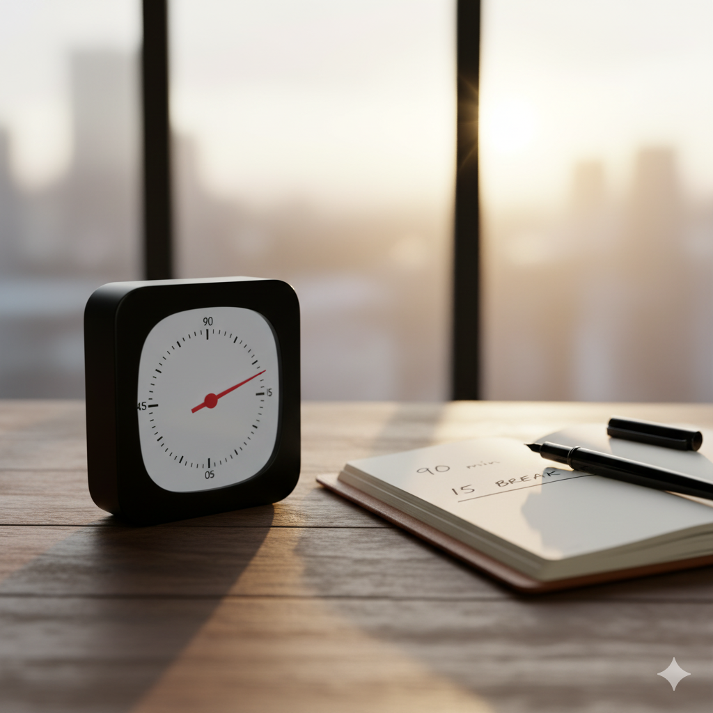 - 타이머 90/15: 90분 몰입 + 15분 회복, 하루 2회부터.