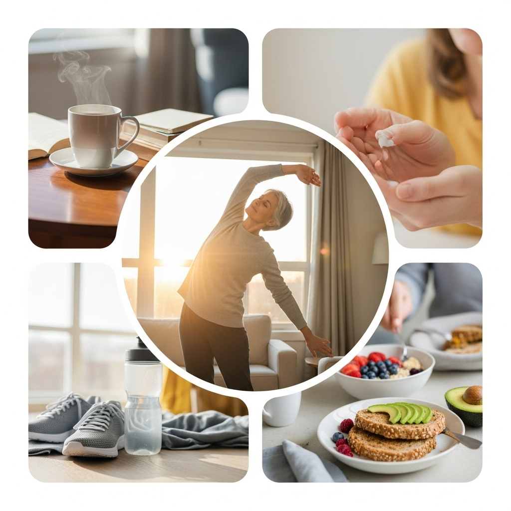 수분 보충은 체내 순환을 깨우고, 가벼운 목·어깨·허리 스트레칭은 뻣뻣함을 줄여 줍니다. 동작 5개를 정해 매일 같은 순서로 반복하세요.