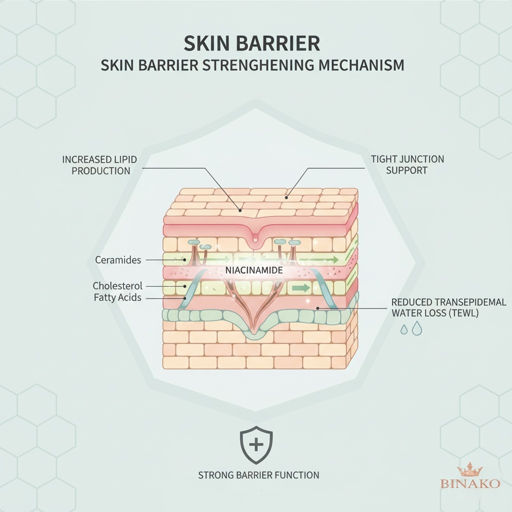 위 삽화는 나이아신아마이드가 피부 장벽을 강화하는 과정을 시각적으로 설명합니다.