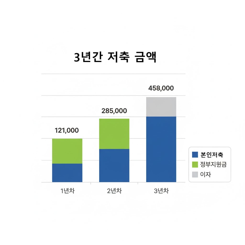 계산은 간단합니다. - 본인 저축액: 10만 원 × 36개월 = 360만 원 - 정부 지원금: 30만 원 × 36개월 = 1,080만 원 - 합계: 1,440만 원