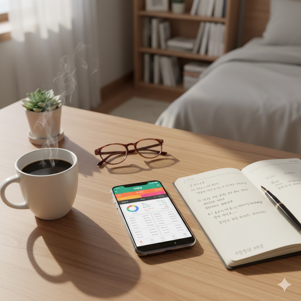 아침루틴: 스마트폰 가계부 앱 대시보드와 노트가 놓인 책상풍경
