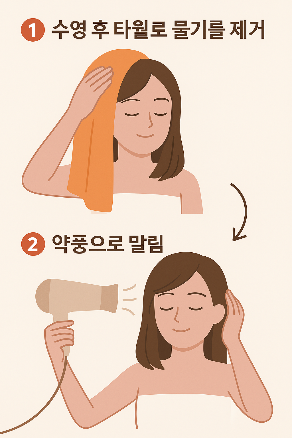 | 젖은 머리 방치 | 냄새, 자극 | 타월로 눌러 닦은 뒤 약풍 건조 |